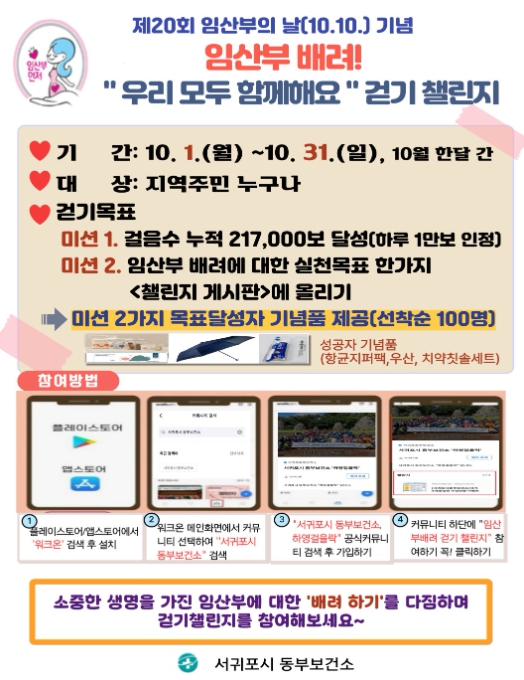 지역주민은 누구나 참여할 수 있으며, 참여기간 동안 217,000보를 달성하고 임산부 배려를 다짐하는 실천목표를 게시판에 인증하는 선착순 100명에게 성공기념품이 제공된다.