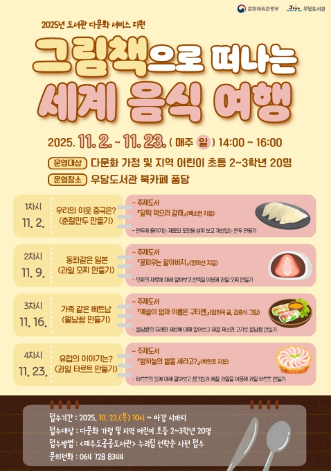 [파이낸셜경제=김영란 기자] 제주시 우당도서관은 2025년 도서관 다문화 서비스 지원 사업인 ‘그림책으로 떠나는 세계 음식 여행’ 프로그램 참여자를 10월 23일부터 선착순 모집한다.