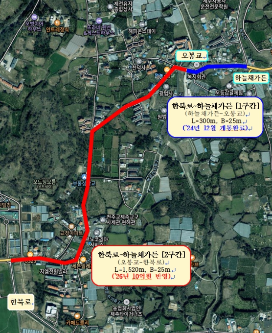 그간 공사비 예산이 반영되지 않으면서 공사가 일시적으로 중단됐으나 제주시는 2026년 공사비 예산 10억을 확보함에 따라 2구간(연장1,520m, 폭25m) 공사를 3월 중 추진한다.
