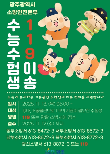 [파이낸셜경제=김예빈 기자] 광주광역시 소방안전본부는 대학수학능력시험일인 11월13일 거동이 불편한 수험생들의 이동 편의를 위해 ‘119 이송지원 서비스’를 제공한다.