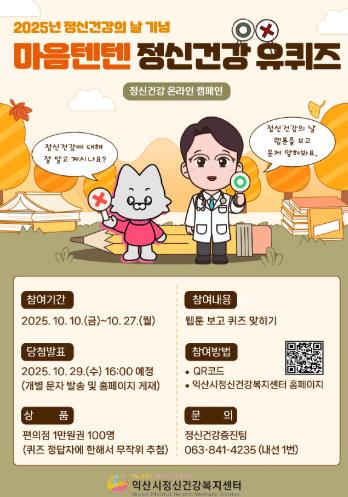 익산시는 정신건강의 날을 맞아 오는 10일부터 27일까지 '마음텐텐' 온라인 캠페인을 운영한다고 2일 밝혔다.