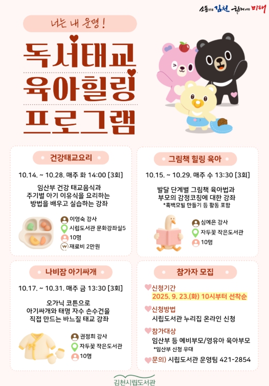 [파이낸셜경제=김지훈 기자] 김천시립도서관은 오는 10월 14일부터 10월 31일까지 예비 부모와 영유아 부모를 대상으로, 시립도서관 본관과 자두꽃 작은도서관에서 '독서태교 육아힐링 프로그램'을 운영한다고 밝혔다.