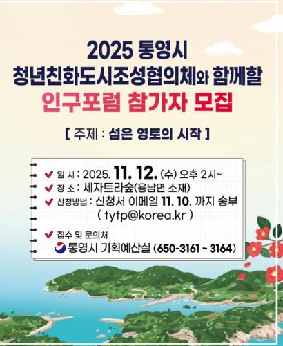 포럼 참가 신청은 통영시 홈페이지에 게시된 신청서를 작성해 이메일로 제출하거나 통영시청 기획예산실 인구청년정책팀으로 문의하면 된다.