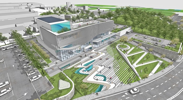 | ▲ 남경주국민체육센터 설계공모 당선작 조감도. 대지 경사면을 활용한 입체적 배치와 개방형 계단광장이 특징이다. |