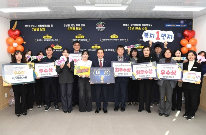 올해 창녕군은 △민관협력 모의사례 경진대회‘대상’ △희망복지지원단 운영 부문‘최우수상’ △찾아가는 보건복지서비스 제공 부문‘최우수상’△고독사 예방 및 관리‘우수상’ △행정안전부 2025년 읍면동 복지·안전 개선 우수사례 경진대회‘우수상’ △장애인복지사업 평가‘최우수상’△경남지역 시군 자원봉사센터 평가 ‘우수상’을 수상하며 7관왕의 영예를 안았다.