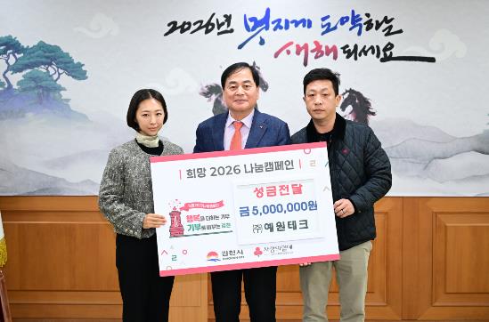 [파이낸셜경제=김지훈 기자] 김천시는 지난 15일, ㈜예원테크(대표 정재욱)로부터 희망2026나눔캠페인 성금 500만 원을 전달받았다고 밝혔다.