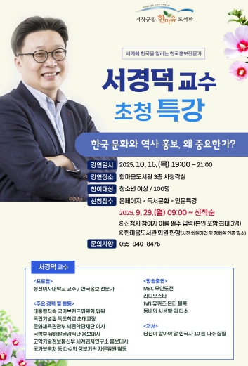[파이낸셜경제=김예빈 기자] 거창군은 한마음도서관에서 10월 16일 저녁 7시 한국을 세계에 널리 알리는 대표 홍보전문가 서경덕 교수 초청 특강을 개최한다.