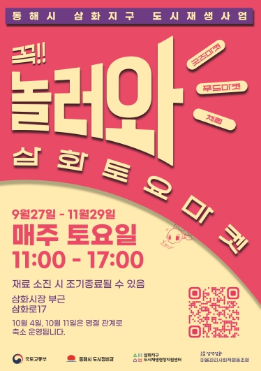 지역고유의 특성과 도시재생 가치를 담아낸 특별한 플리마켓, ‘놀러와, 삼화토요마켓’이 오는 9월 27일부터 11월 29일까지 매주 토요일(오전 11시~오후 5시) 개최된다.