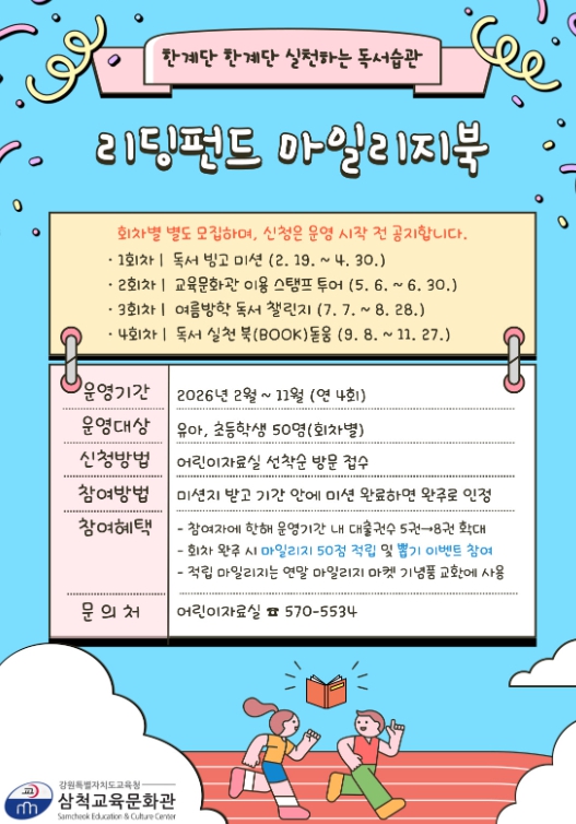 [파이낸셜경제=조성환 기자] 삼척교육문화관은 관내 유아·초등학생을 대상으로 2월부터 11월까지 어린이 독서 실천 프로그램 ‘리딩펀드 마일리지북’을 운영한다.