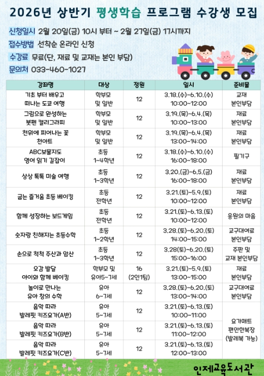 | ▲ 인제교육도서관, 2026년 상반기 평생학습 프로그램 운영 |