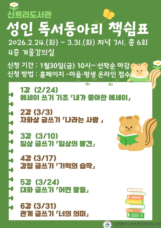프로그램은 2월 24일부터 3월 31일까지 6회에 걸쳐 운영되며, 모집은 1월 30일부터 2월 18일까지 신트리도서관 누리집에서 선착순으로 진행된다.