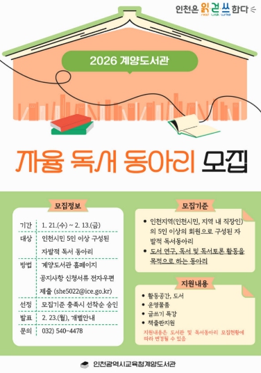 [파이낸셜경제=김기보 기자] 인천광역시교육청계양도서관은 지역 내 독서 문화를 확산하고 시민의 자발적인 독서 활동을 지원하기 위해 ‘2026년 자율 독서동아리’를 모집한다.