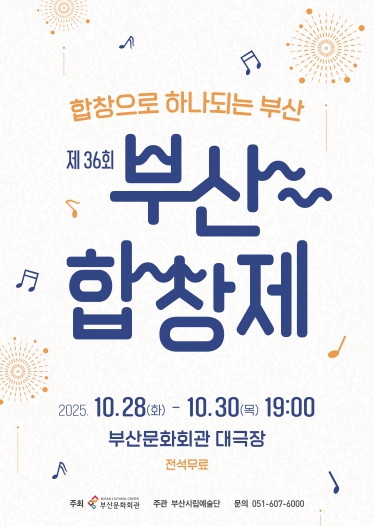 부산시립합창단(예술감독 이기선)이 마련한 『제36회 부산합창제』가 10월 28일부터 30일까지 3일간 오후 7시 부산문화회관 대극장에서 개최된다. 1985년 시작된 부산합창제는 부산 지역에서 가장 오랜 전통을 자랑하는 합창 축제로, 올해로 제36회를 맞이한다.