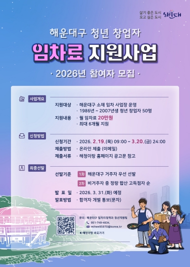 신청은 2월 19일부터 3월 20일까지 이메일을 통한 온라인 접수로 진행되며, 서류 심사를 거쳐 3월 말 최종 선정자를 발표할 예정이다. 자세한 사항은 해청이랑(해운대청년온라인플랫폼) 및 해운대구청 홈페이지에서 확인할 수 있다.