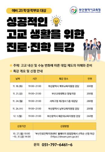 강의는 ▲학교폭력 조치사항 반영 ▲전공자율선택제 확대 ▲계약학과 신설 ▲고교 과목이수 정성평가 도입 등 대입전형의 주요 변화 사항을 중심으로 진행되며, ‘2028학년도 대입제도 이해와 준비’ 등 다수의 진학 관련 강연을 진행해 온 부산진로진학지원센터 강동완 센터장이 강사로 참여한다.