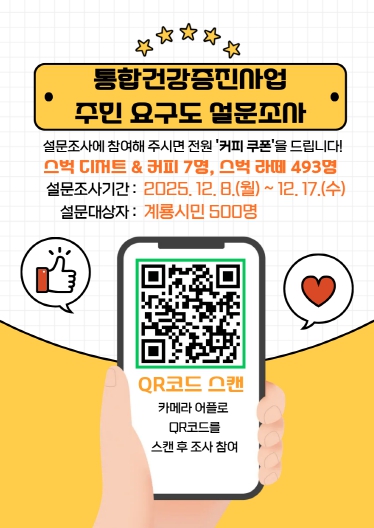 [파이낸셜경제=김영란 기자] 계룡시는 시민 건강증진을 위해 ‘2025년 통합건강증진사업 지역주민 설문조사’를 12월 8일부터 17일까지 온라인 방식으로 실시한다고 밝혔다.