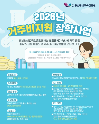 지원 대상은 공고일 기준으로 충남에 1년 이상 계속 거주 중인 본인 또는 부모를 둔 천안행복기숙사 입사 대학생이며, 실제 기숙사 거주기간을 기준으로 학기당 최대 30만 원, 연간 최대 60만 원의 거주비를 지원한다.