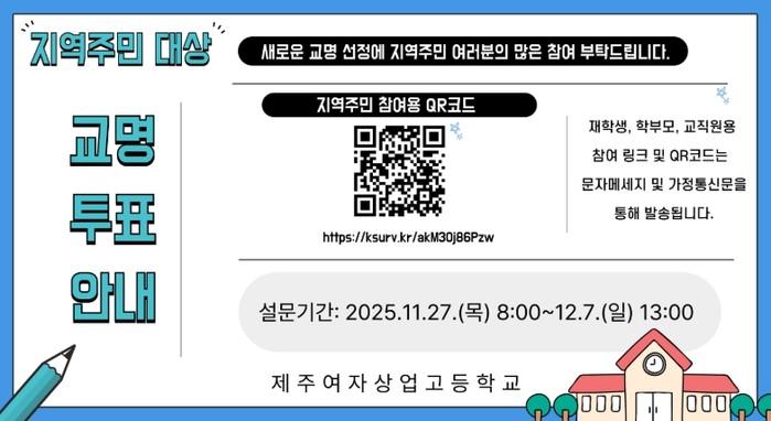 교명 선택을 위한 온라인 설문은 27일 오전 8시부터 내달 7일 오후 1시까지 본교 재학생과 보호자를 대상으로 진행되며 학생과 보호자, 교직원·동문·지역주민 등 다양한 주체가 온라인 설문 링크와 빠른응답코드를 통해 손쉽게 참여할 수 있다.