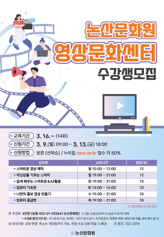 [파이낸셜경제=김영란 기자] 논산문화원 부설 영상문화센터는 시민들의 미디어 활용 역량 강화를 위해 2026년 상반기 교육 수강생을 모집한다.