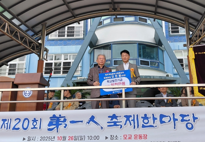 [파이낸셜경제=김영란 기자] 제주도교육청 제주제일중학교는 26일 열린 제20회 제주제일중학교 총동문회‘제일인(弟一人) 축제 한마당’에서 제8회 졸업생 오헌봉 ㈜유성건설 회장이 학교 발전을 위해 2025년부터 2027년까지 3년간 매년 1천만 원씩, 총 3천만 원의 발전기금을 기탁하기로 하고 첫 해분 1천만 원을 전달했다고 밝혔다.