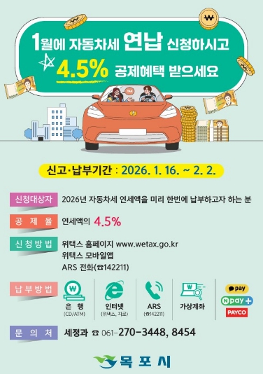 [파이낸셜경제=김예빈 기자] 목포시는 1년치 자동차세를 1월에 미리 납부하면 세액 공제 혜택을 받을 수 있는 ‘자동차세 연납제도’를 한 달간 운영한다고 밝혔다.