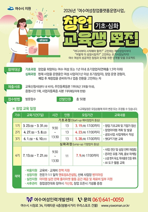 | ▲ 2026년 여수여성창업플랫폼운영 창업 교육생 모집 포스터 |