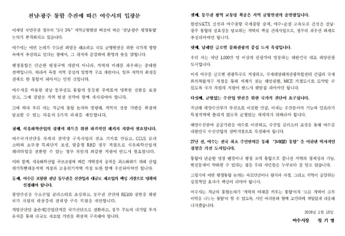 정기명 여수시장은 “여수는 과거 전국 최초로 주민발의를 통한 ‘3려 통합’을 이뤄낸 자치 분권의 상징적 도시”라며 “이번 행정통합이 여수의 정체성을 지키면서도 새로운 도약의 기회가 될 수 있도록 시민들과 함께 치밀하게 대응해 나가겠다”라고 밝혔다.