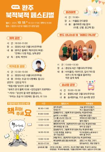 ‘북적북적 페스티벌’은 올해 12회를 맞이한 완주군의 대표 책 축제로, 완주군과 책읽는지식도시완주 추진위원회(위원장 김선태)가 공동 주최한다.