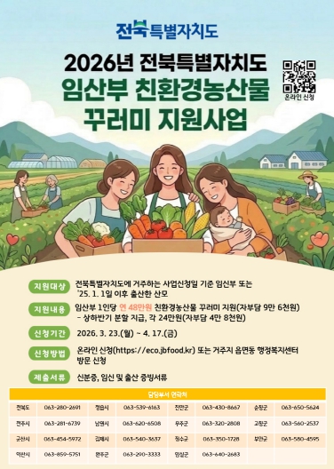 정재관 전북자치도 스마트농산과장은 “임산부 친환경농산물 꾸러미 지원사업은 미래 세대의 건강을 챙기고 친환경 농가의 판로 확보를 돕는 의미 있는 사업”이라며 “도내 임산부들의 많은 관심과 적극적인 신청을 바란다”라고 말했다.