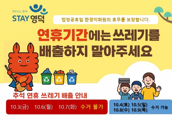 다만, 영덕군은 명절 전날 추석맞이 특별 환경 정화 활동을 시행해 고향으로 돌아오는 귀성객들에게 쾌적한 환경을 제공하고, 군 누리집, 소식지 등을 통해 연휴 기간 중 쓰레기 분리배출 요령 등을 안내할 예정이다.
