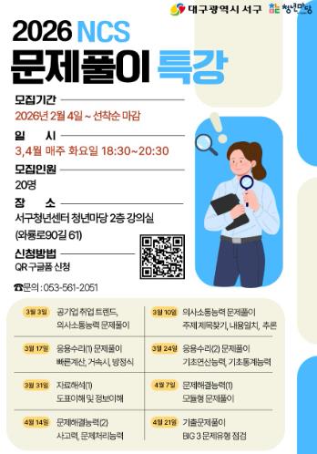 [파이낸셜경제=김지훈 기자] 대구 서구는 관내 청년들의 취업 경쟁력 강화를 위하여 서구청년센터 청년마당 강의실에서 NCS(국가 직무능력 표준) 문제 풀이 특강 참여자를 모집한다고 밝혔다.