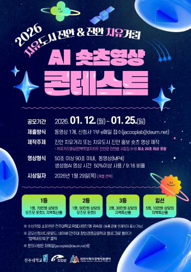 전주대학교 이재민교수는“이번 AI 숏츠 영상 콘테스트는 주민 참여형 리빙랩 성과를 콘텐츠로 확장하는 계기가 되고, 창의적인 홍보 콘텐츠를 통해 치유도시 진안의 브랜드 인지도가 높아지기를 기대한다.”고 밝혔다.