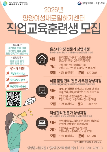 [파이낸셜경제=조성환 기자] 양양여성새로일하기센터는 취·창업을 희망하는 여성을 대상으로 2026년도 직업교육훈련생 50명을 모집한다.