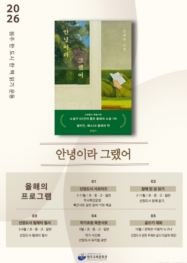 [파이낸셜경제=조성환 기자] 강원특별자치도교육청원주교육문화관(관장 용석태)은 시민 독서 문화 확산과 책 읽는 공동체 조성을 위해 2026년 ‘원주 한 도시 한 책 읽기 운동’ 사업의 일환으로 연중 다양한 독서 참여 프로그램을 운영한다.
