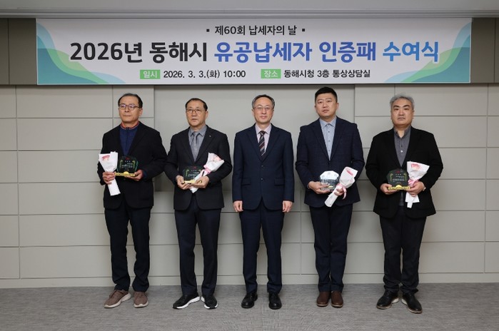 [파이낸셜경제=조성환 기자] 동해시는 3월 3일 '제60회 납세자의 날'을 맞아 시청 통상상담실에서 유공납세자 인증패 수여식을 열고 성실납세자들에게 감사의 뜻을 전했다.