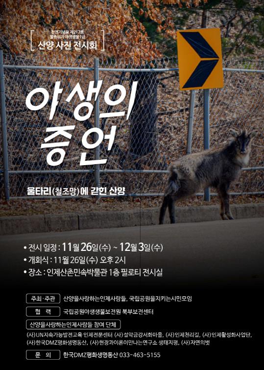 이번 전시 사진의 대부분은 인제군 주민들이 2023~2024년 겨울 폭설·한파, ASF 울타리 설치로 인한 서식지 파편화 등의 영향으로 민가나 도로변에 내려온 산양을 보호하기 위해 먹이 공급 활동을 하며 기록한 장면들이다.