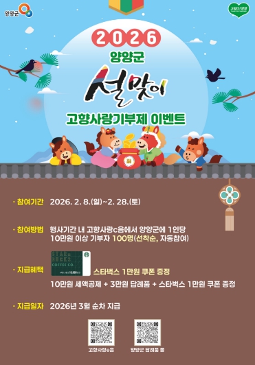 [파이낸셜경제=조성환 기자] 양양군이 2026년 설 명절을 맞아 고향사랑기부제 참여 확산을 위해 '붉은 말의 해! 고향사랑기부제 설맞이 이벤트'를 실시한다.