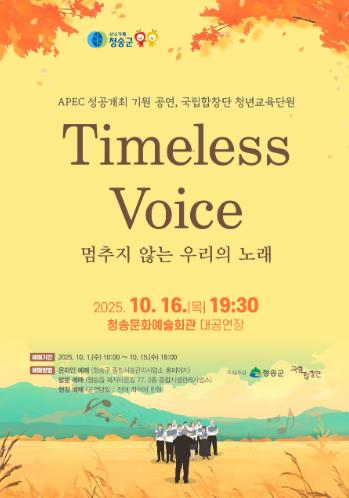 [파이낸셜경제=김영란 기자] 청송군은 오는 16일 저녁 7시 30분, 청송문화예술회관 대공연장에서 APEC 성공개최를 기원하는 국립합창단 청년교육단원 공연 ‘Timeless Voice – 멈추지 않는 우리의 노래’를 개최한다.