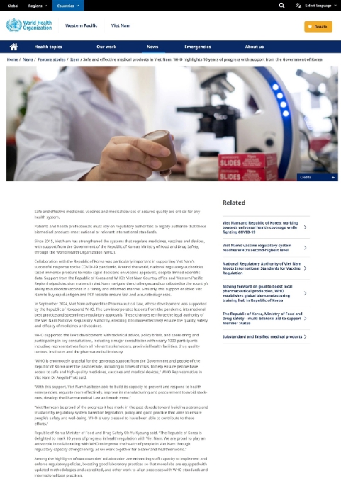 WHO 기사의 주요내용은 ▲코로나19 대유행 시 신속하고 정확한 코로나19 진단기술 확보 ▲글로벌 기준이 반영된 의약품법 제정(2024년 9월)을 통한 허가체계 간소화 ▲규제기관 담당자의 역량 강화 등 베트남의 규제 수준 제고와 보건위기 예방 및 대응 역량 강화에 식약처가 기여했다고 다뤘다.