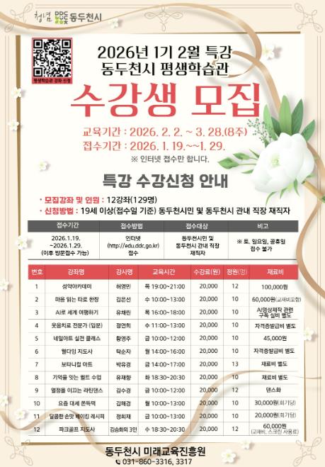[파이낸셜경제=김기보 기자] 동두천시는 시민의 자기계발과 평생학습 참여 기회를 확대하기 위해 2026년 평생학습관 2월 특강 수강생을 모집한다고 밝혔다.