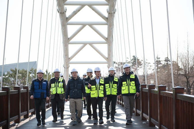 김재보 이사장을 비롯한 합동 점검반은 사업장 내 시민들의 이용이 잦고 해빙기 취약 시설로 꼽히는 구역들을 비롯하여 ▲교량 구조 이상 여부 ▲야외 운동기구 상태 점검 ▲지반 침하·붕괴 우려 옹벽 및 경사면을 집중적으로 점검했다.
