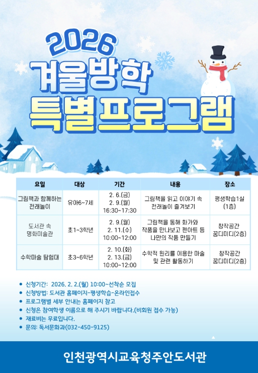 [파이낸셜경제=김기보 기자] 인천광역시교육청주안도서관은 관내 유·초등학생에게 다양한 평생학습 기회를 제공하기 위해 2월 6일부터 13일까지 ‘겨울방학 특별프로그램’을 운영한다.