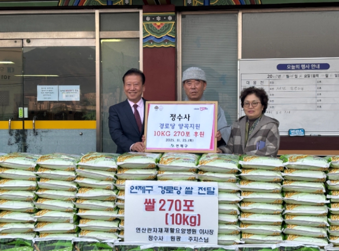 [파이낸셜경제=박영진 기자] 연제구는 11월 25일 정수사(주지 원광스님)로부터 관내 경로당을 위한 양곡 10kg 270포를 기탁 받았다.