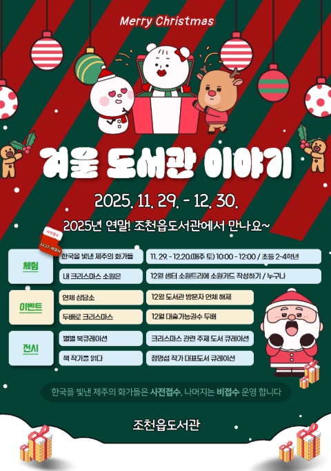 [파이낸셜경제=김영란 기자] 제주시 조천읍도서관은 지역 주민에게 따뜻한 겨울의 추억을 선사하기 위해 11월 29일부터 12월 30일까지 송년 특별 프로그램 ‘겨울 도서관 이야기’를 운영한다.