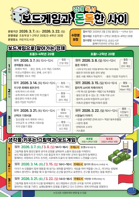 이번 프로그램은 3월 7일부터 22일까지 어린이도서관에서 ▲보드게임으로 알아가는 경제 ▲생각을 키우는 그림책과 보드게임 등 2개 과정으로 진행된다.