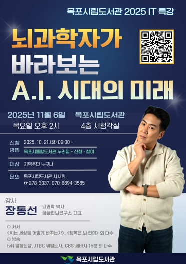 [파이낸셜경제=김예빈 기자] 목포시립도서관은 오는 11월 6일 오후 2시, 급속히 확산되는 인공지능 시대에 발맞춰 지역 주민을 위한 특별 강연을 개최한다.