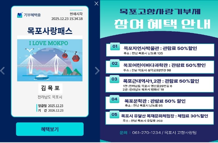 ‘목포사랑패스’는 목포시에 10만 원 이상 고향사랑기부를 하면 자동으로 발급되며, 고향사랑e음 누리집 마이페이지에서 확인할 수 있다.