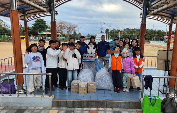 학생자치회 주도로 가정과 학교에서 모은 투명 페트병을 수거하며 생태계 보존을 위한 자원순환의 의미를 되새겼다.