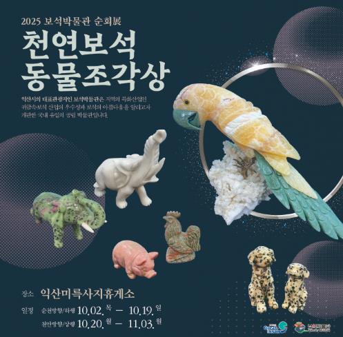 [파이낸셜경제=김예빈 기자] 익산시 보석박물관은 추석 연휴가 시작되는 10월 2일부터 11월 3일까지 익산미륵사지휴게소(양방향)에서 '천연보석 동물조각상' 순회전시를 진행한다.