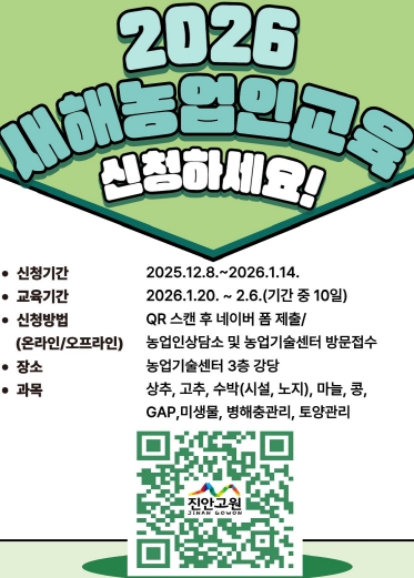 접수는 △농업기술센터 홈페이지 공지사항의 QR코드 온라인 접수 △읍·면 농업인상담소 방문 △농업기술센터 방문 등으로 진행해 참여할 수 있다.